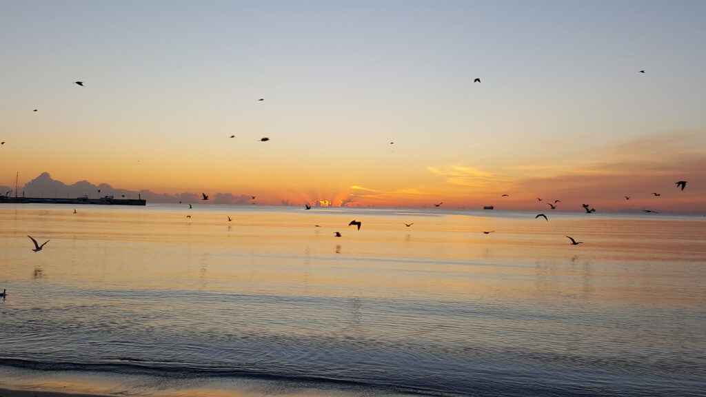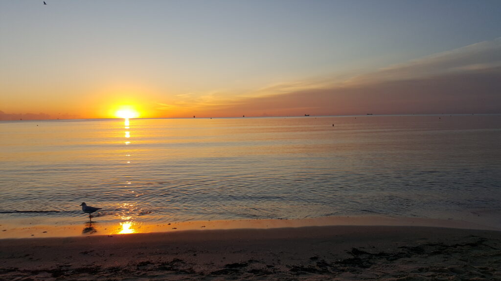 Zdejmuję buty i siadam dokładnie w momencie, kiedy wielka złota kula wyłania się zza horyzontu. Czuję zimny piasek pod stopami. Szum fal. Widzę młode mewy z matkami, słyszę ich pisk. Lecą, kiedy słońce wschodzi całe, spokojnie unoszą się nad wodą, wydają się czarne na tle naszej gwiazdy. Widzę parę statków, jachty, drobne sylwetki ludzi na pokładach. Promienie słońca układają się wzdłuż brzegu na niespokojnej wodzie, długi pomarańczowy pas światła jest dokładnie naprzeciwko mnie. Jest nierówny, tak samo jak powierzchnia wody zmącona przez fale. Jakby ktoś machnął pędzlem. Wszystko takie ulotne, trwa tylko sekundkę, mrugam i krajobraz jest inny. A jednak na chwilę zatrzymuje się czas. W pamięci mam jeden najpiękniejszy moment, scenę, której nigdy nie zapomnę. Już wiem czemu Monet, namalował swój „Wschód słońca”. Piękno jego ulotności, nieuchwytność chwili. Potrzebowałam to przeżyć.