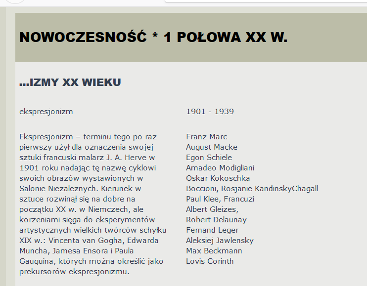 Przed ekspresjonizmem był realizm, po realizmie – impresjonizm? A po ekspresjonizmie – postimpresjonizm? Co?? Jak?? Kiedy niby?? Jakoś niezgrabnie pani to ułożyła. Tak się to właśnie kończy, jak się nie potrafi korzystać z Internetu, tylko wchodzi się na pierwszą stronę, która wyskoczy w Google i CO Z TEGO, że na górze widnieje napis: „Uwaga: materiał znajduje się w opracowaniu i może zawierać jeszcze wiele luk i błędów”. Bierzem to Jacuś, huk nas to wszystko obchodzi. Wklejem to na slajda i będzie git.